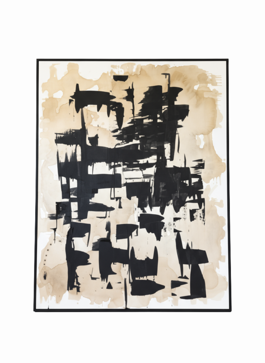 Sobre un fondo creado con café —materia viva que aporta textura, aroma y tiempo— las formas se expanden sin pedir permiso. Trazos intensos se superponen, se interrumpen y renacen, en un diálogo entre estructura y libertad. Lo espontáneo se vuelve lenguaje, y el caos encuentra equilibrio en la repetición consciente.
